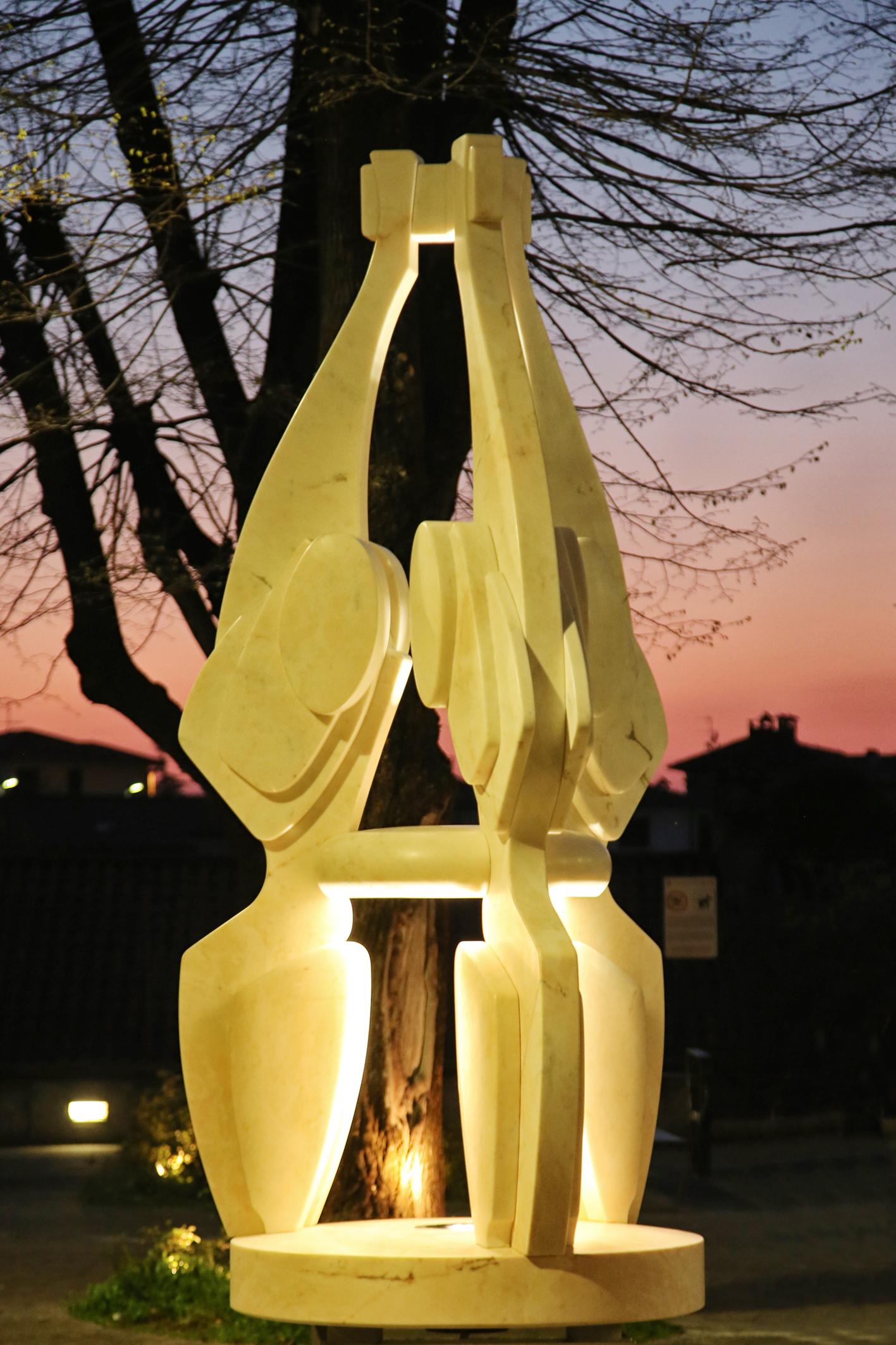 “In tanti anni Galbusera ha avuto accanto un proprio personalissimo angelo, che lo ha custodito e accompagnato nel viaggio innamorato attraverso la fabbrica della materia, attraverso il bronzo, l’acciaio, l’ottone, il vetro, la ceramica, la pietra vulcanica, fino ad arrivare qui al niveo biancore del marmo d’Anatolia e al calore-colore ambrato del legno d’ulivo”