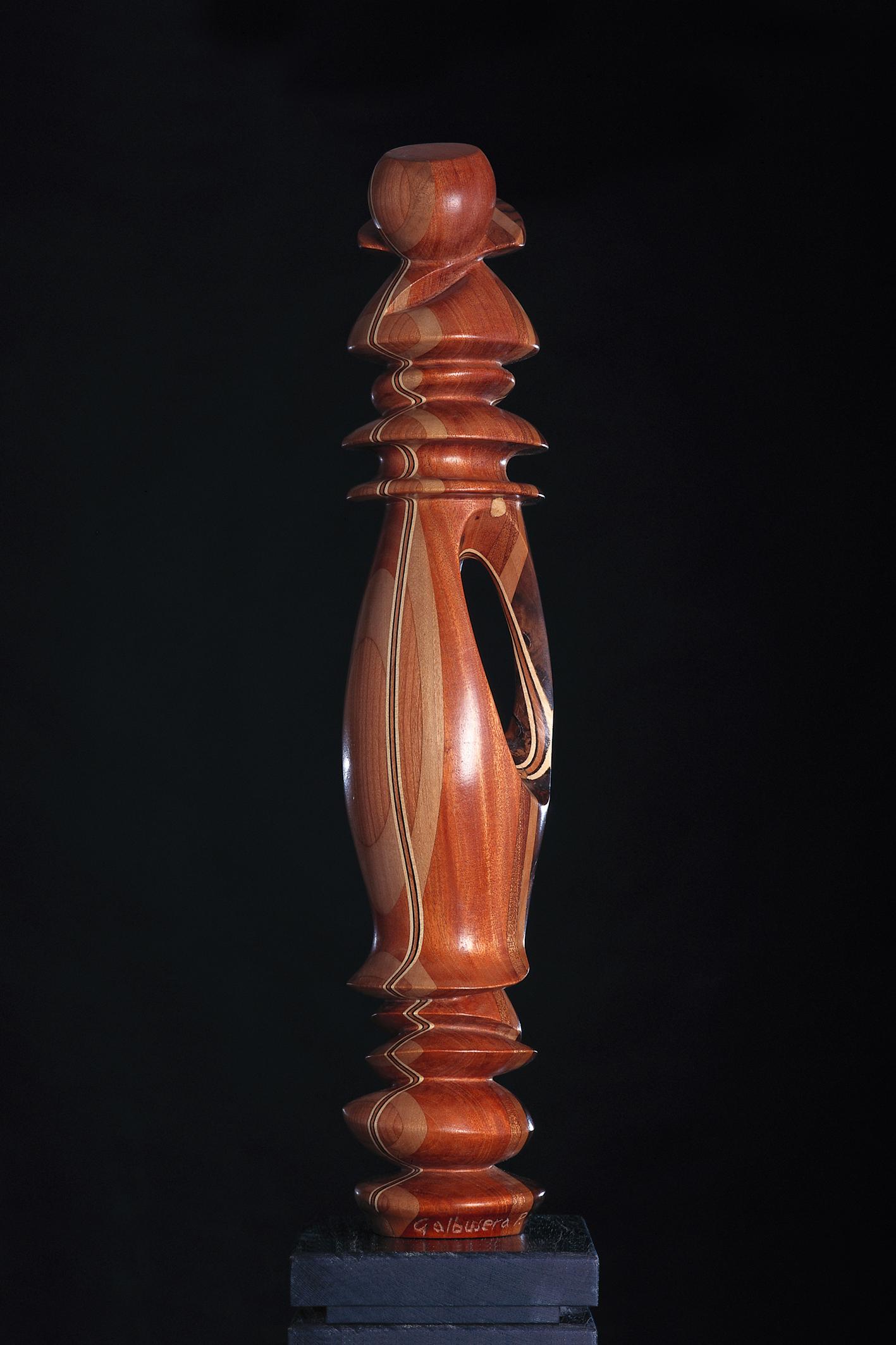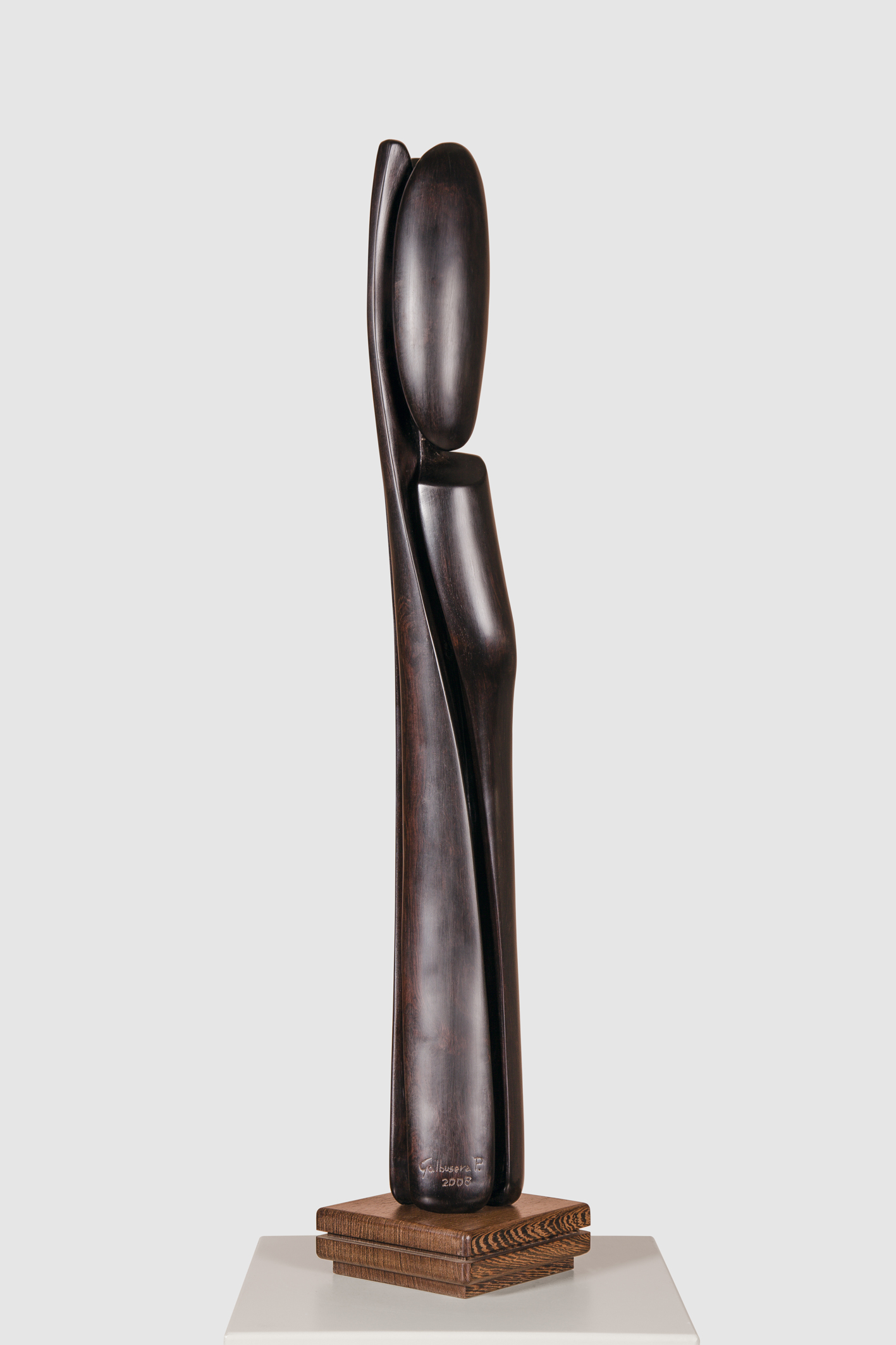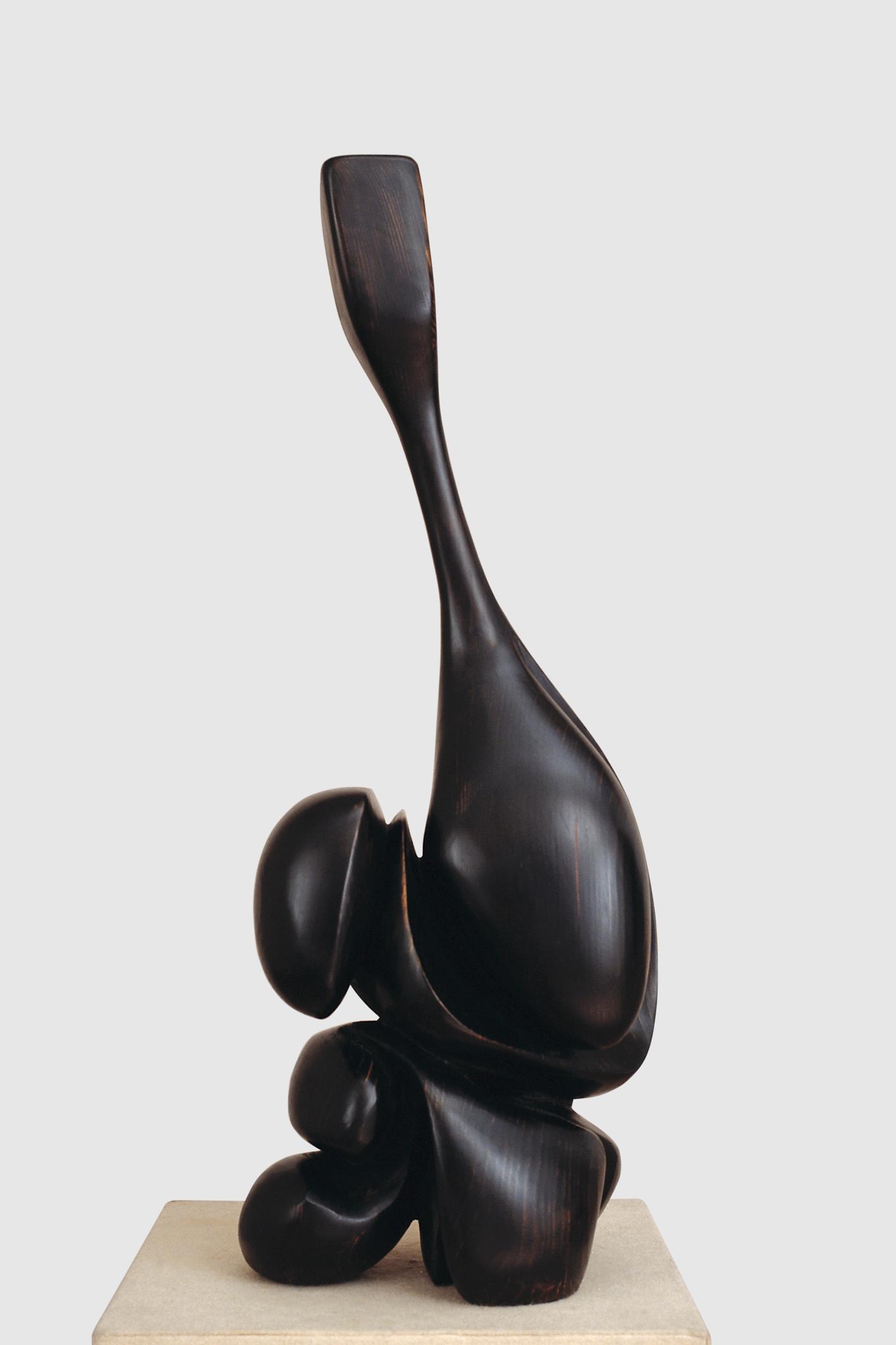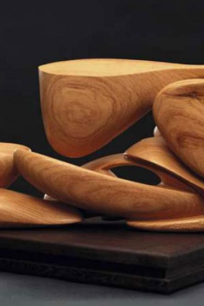 “Le sculture in radica di tuja e in radica di amboina richiamano alla mente processi di creazione, cristallizzazione e metamorfosi: le curve, morbide e rotonde, tolgono peso a una materia che si concede alla deflagrazione della luce, rivelando una serie di nervature – più accentuate nella tuja – che rendono ogni legno unico”.