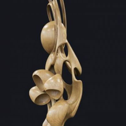 “Le sculture in radica di tuja e in radica di amboina richiamano alla mente processi di creazione, cristallizzazione e metamorfosi: le curve, morbide e rotonde, tolgono peso a una materia che si concede alla deflagrazione della luce, rivelando una serie di nervature – più accentuate nella tuja – che rendono ogni legno unico”.