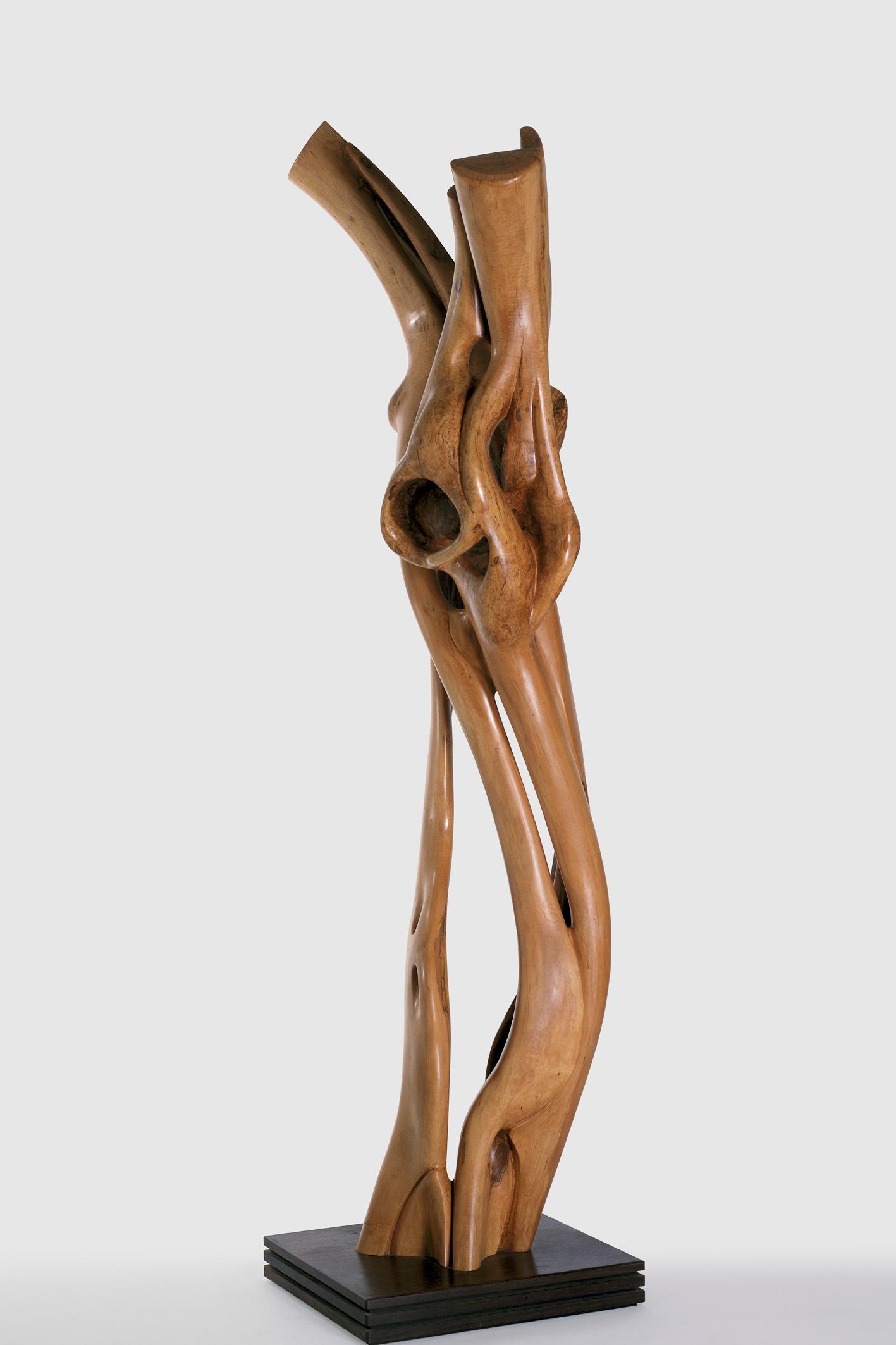 “Le sculture in radica di tuja e in radica di amboina richiamano alla mente processi di creazione, cristallizzazione e metamorfosi: le curve, morbide e rotonde, tolgono peso a una materia che si concede alla deflagrazione della luce, rivelando una serie di nervature – più accentuate nella tuja – che rendono ogni legno unico”.
